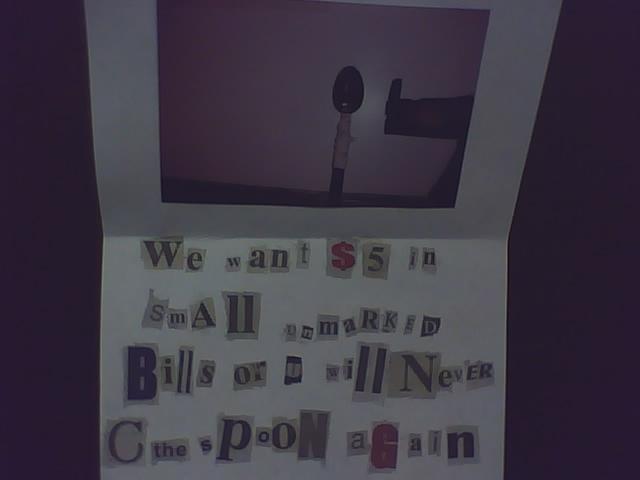 I appreciate the effort. Really. However, I can’t even tell it’s my spoon. It could be just some spoon that looks like mine. Unless I can actually talk to the spoon and confirm that it is mine, there is no deal. Also, ransom notes generally list details like where I should leave the money, but still, A+ for effort.