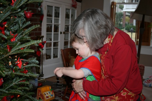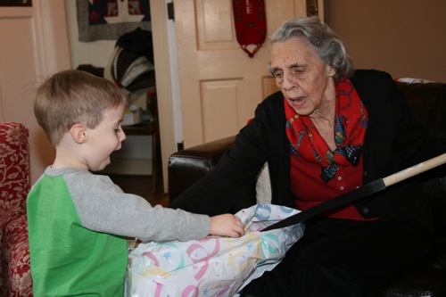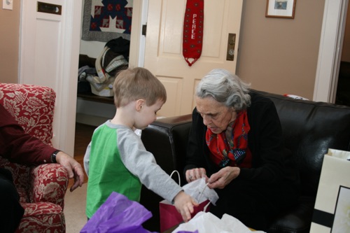 Paige helps Gran open her present: