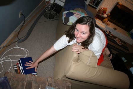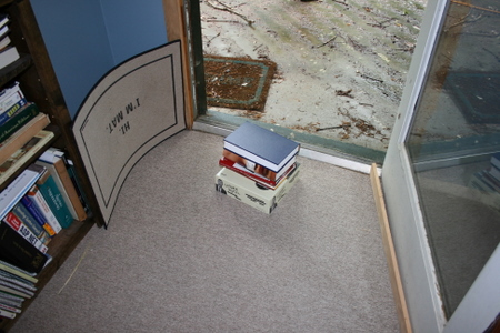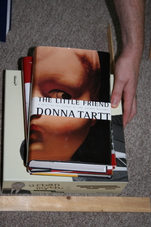 In case you can’t tell — both couches are moved, there’s a dolly in the left corner of the picture (used to lift up the trunk that was also moved and propped up on shims and books), the lamps are moved, and the coffee table is sideways in the center of the room. What the picture doesn’t show is that there was also a towel stuffed under the door to the hallway, the doors to the hutch were open, at least three of the games were sitting out and missing their tops (which were spread around the room to be used as skink catchers), and there’s a broom in the middle of the room. When I got down there Matt had him cornered under the couch but when I used the broom to try to shove him out towards Matt he ran and we discovered that he fit under the “baseboard” (the strip of wood that someone apparently thought would pass for a baseboard at some point during the remodeling of the basement). Matt tried slowly running a shim under the baseboard in a vein attempt to flush him out that way. Eventually the baseboard was removed but Fred wasn’t giving up that easily so we ended up sitting on the couches watching Must See TV on Tivo in hopes that he would come running out. One of the helpful skills I’ve acquired during the past week has been an ability to hear a skink running (no lie), so when I heard him we were on the move again. To make a (very) long story a little shorter, the end result (after a fantastic show of reptilian prowess on everyone’s part) was this (Fred’s under the Urban Myth game box top (yes, Matt noted the irony) which is under several books including a particularly apt title):