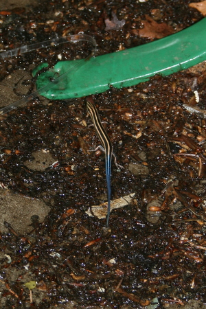The only clue I have about what this might be is in the glint of blue on the tail, which triggered a memory I have of a conversation I had with our neighbor last week in which we discussed the mosquitos around here and also in which she said that the mosquitos are actually much better now than they used to be as a result of the fact that our other neighbor now has a bat house in his backyard and that the skinks (which she described as little lizards with blue tails) have moved into the neighborhood and they also eat mosquitos.
