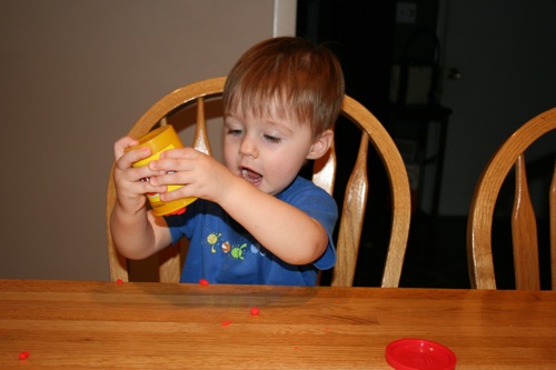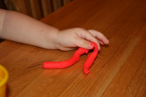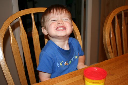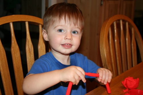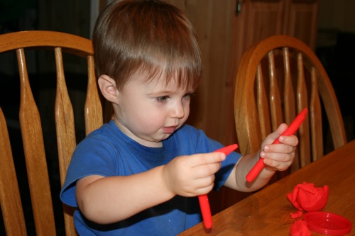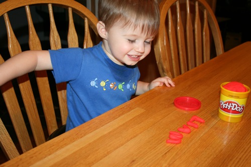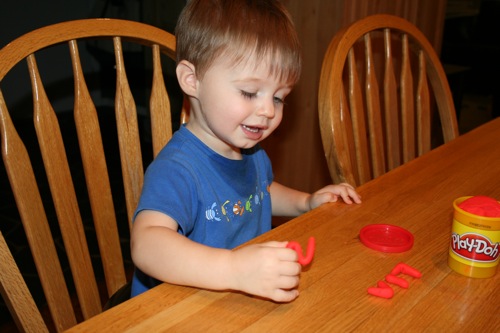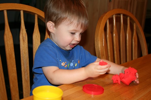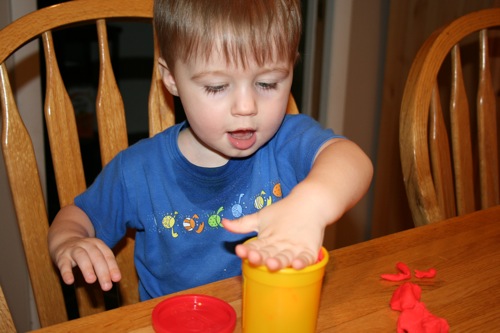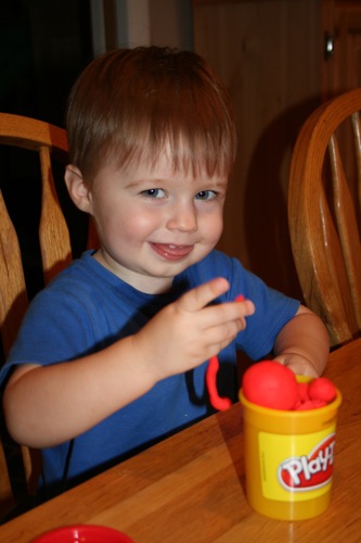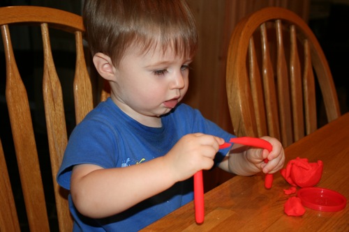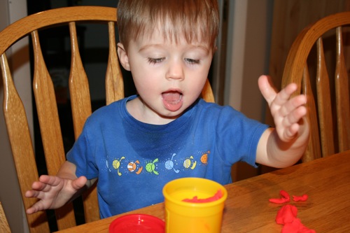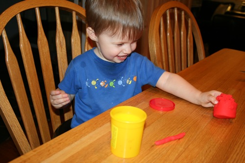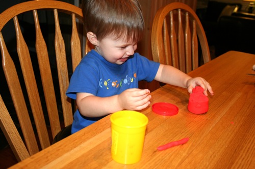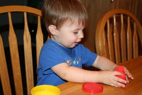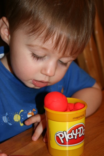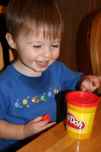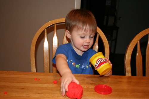 On Thursday I attempted to keep Liam focused on something other than the fact that he couldn’t go outside by breaking out the Play-Doh for the first time. His main focus was on taking it out and putting it back into the container, which is not a huge surprise. It kept him occupied for at least 30 minutes so I consider it a win.