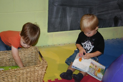 Liam picks a book from the basket while Walker…well…