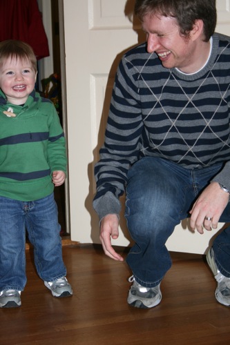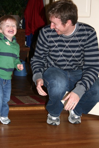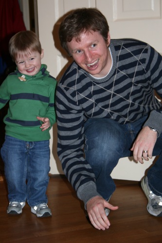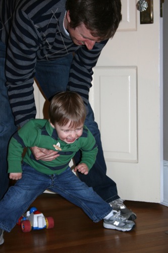 White flour and high fructose corn syrup combine to create quite a sugar high. Who’d’ve thunk it? The primary result was about 20 minutes of Liam rolling a car down the hall at my parents’ house and screaming with delight as it was rolled back and Matt helped him jump over it as it came his way (let no one ever say that silliness isn’t valued in this family). The secondary result was some of my favorite pictures of Matt and Liam: