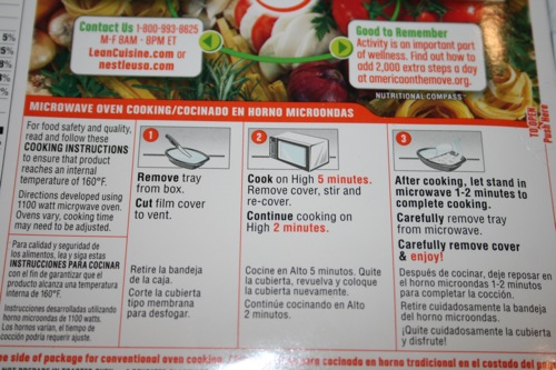Knowing that posting this will expose the facts that I am A) a little OCD about reading directions, even when I know them by heart and B) eating entirely too much Lean Cuisine as of late, I forge onward.
