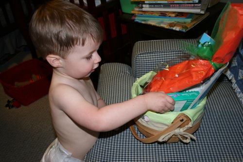 Here’s where we tried to take other things out of the basket to show Liam. You can see how interested he was…