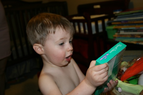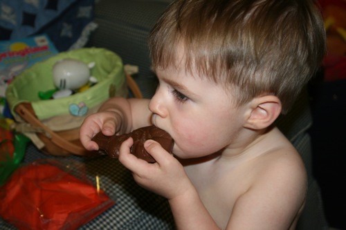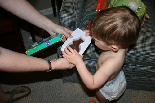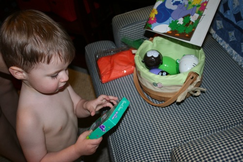 As you’ll notice the Easter Bunny brought a coloring book, a package (containing a little toy and a CD), and some Easter candy. As you’ll also notice, Liam’s attention went immediately to the chocolate bunny and he hasn’t opened anything else yet.