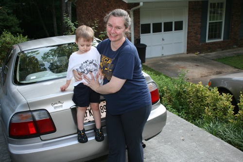 While not a complete shock to the system, it’s a pretty big leap to go from a 5-speed Civic to a minivan. I can now get in and out of my vehicle without grunting or difficulty. For the first time in my 16 years behind the wheel I have a cupholder that accommodates my Nalgene bottle. The 6-disc CD changer means that I can load up Liam’s music and my music in equal quantities for easy retrieval when my passenger has lost his patience. There is a nook for my sunglasses. Matt and I can adjust the AC to our own preferences. At the same time. There is plenty of room for a Costco run that includes diapers, paper towels, toilet paper, and copious amounts of fruits and veggies. At the same time. There’s room to stash my purse and have a passenger. At the same time.