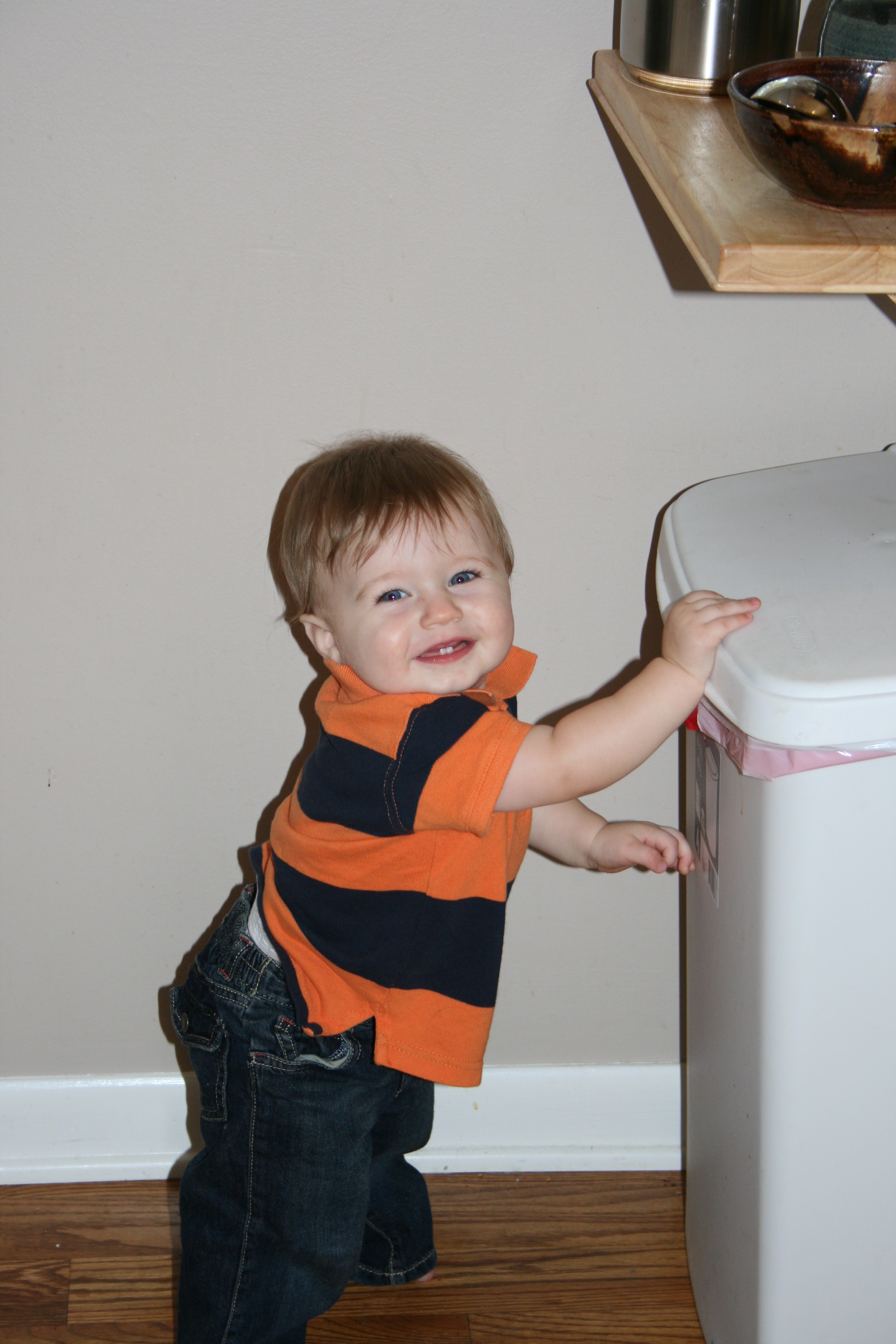 You’ve gotta give the kid credit for good timing since yesterday before Matt got home to give me the trash can Liam managed to knock the thing (and its contents) over onto the floor. By the time Matt got here it was in the bonus room. He’s also come home to find it on the kitchen table (sanitary, huh?). Do you know how hard it is to cook without a trash can?