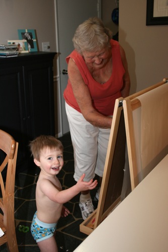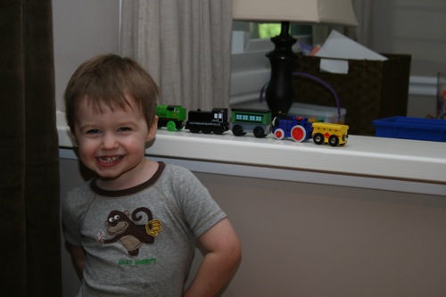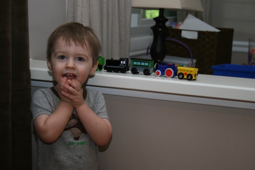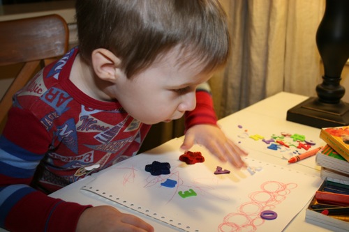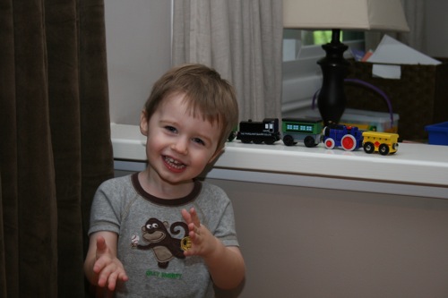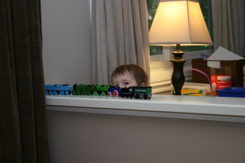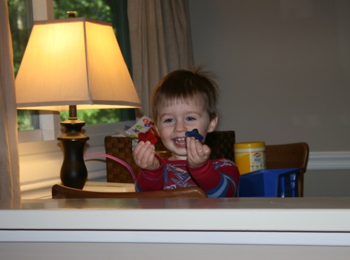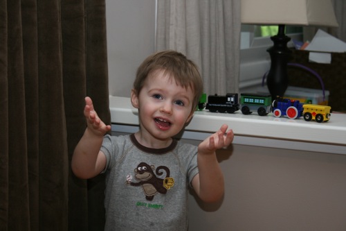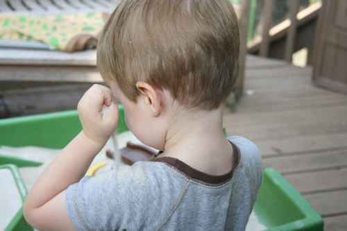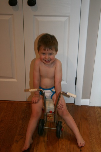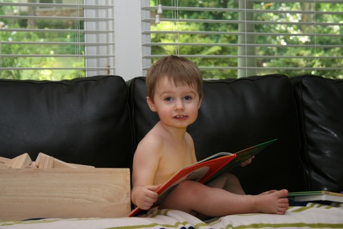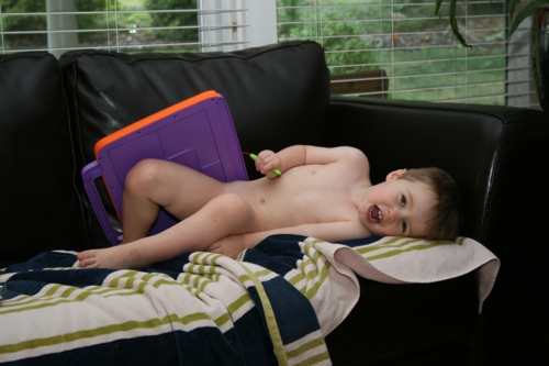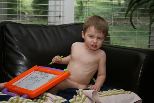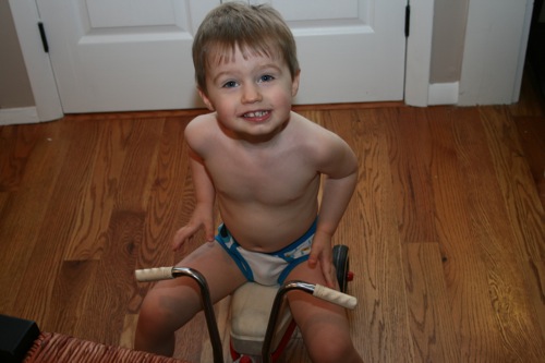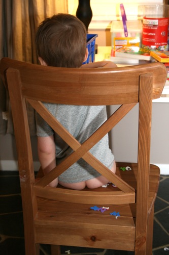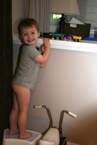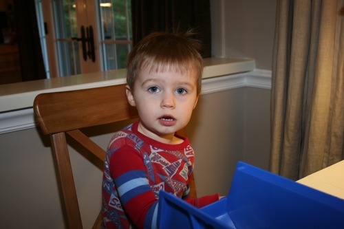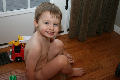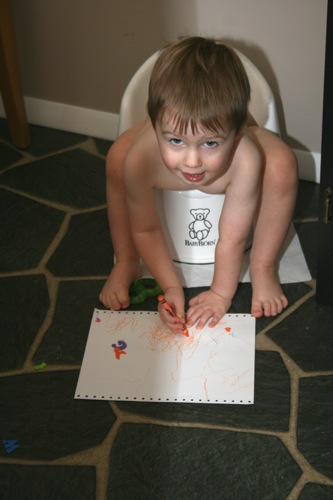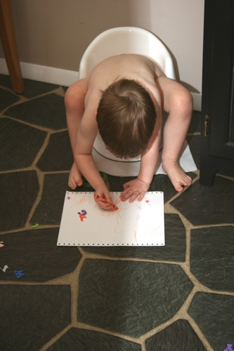 Due to the potty training house arrest we’ve been under we haven’t left the house in days and days. As a result, Liam has tried out just about every inside activity that doesn’t include television (he did watch 45 minutes of Sesame Street this morning, but it resulted in pee on my bedroom carpet so that won’t happen again for a while). The other result of being trapped in the house for days on end with a toddler and his bodily functions is that I’ve taken quite a few pictures to document the experience. We’re by no means finished with the process, but if I don’t get some of these pictures up now, it will take me untold hours to sort through them all when we are finally finished (or he turns 18, goes to college, and his urinary habits become his roommate’s problem, whichever comes first). So, here goes: