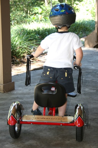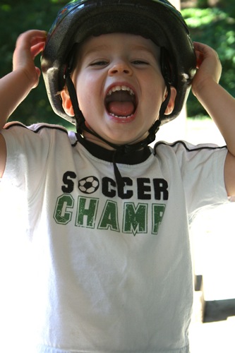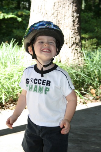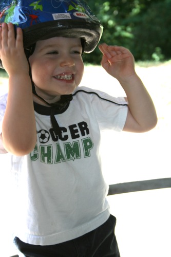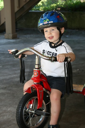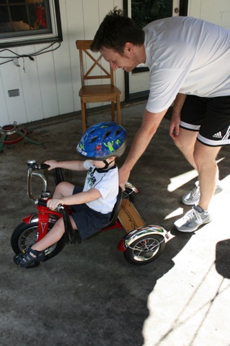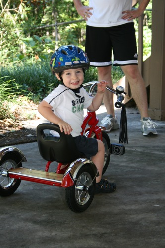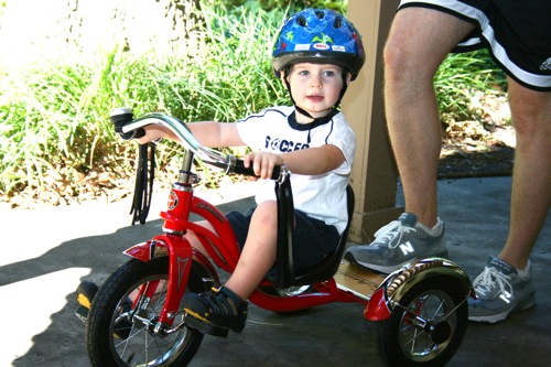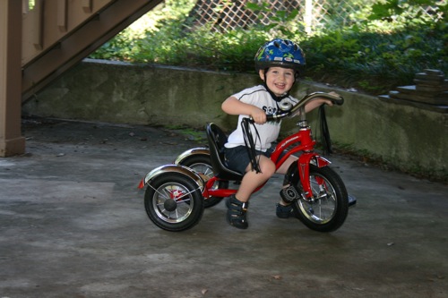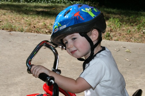 Today we finally broke Liam’s tricycle out of its box.  We had originally planned to do so in the spring, but stuff happens and here we are in September just getting around to it.  He was very excited to put on his helmet and get started.  He doesn’t quite understand the concept of pushing the pedals to power the trike, but he can still scoot along at record speed and with practice I think he’ll really enjoy it.  For now his favorite part might just be the bell.  Here are some pictures we took of the big event: