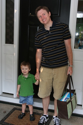 1. Matt did it this morning, but he said it went some better than Tuesday. Still crestfallen, still tears, still needed to be picked up by the teacher, but he apparently seemed more resigned that he would be staying. The teachers told me when I picked him up that all it took was distraction with a train and he was completely fine for the rest of the morning. He was in great spirits when I picked him up and reported having a great time.