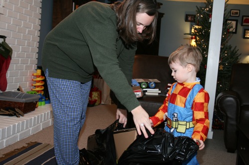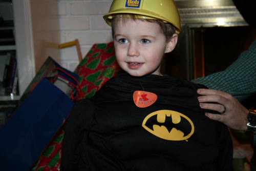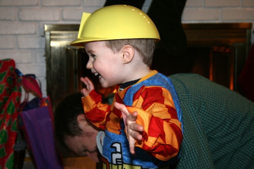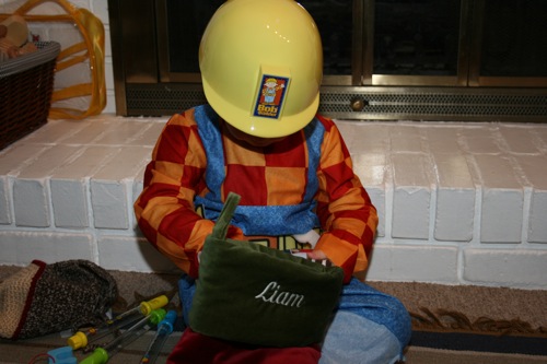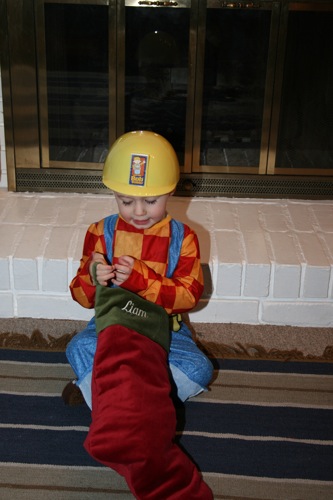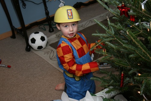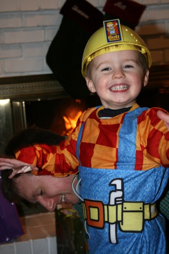 Liam refused to check out his stocking until he was fully outfitted as Bob The Builder: