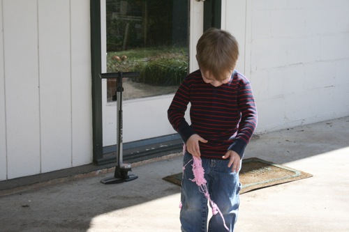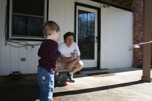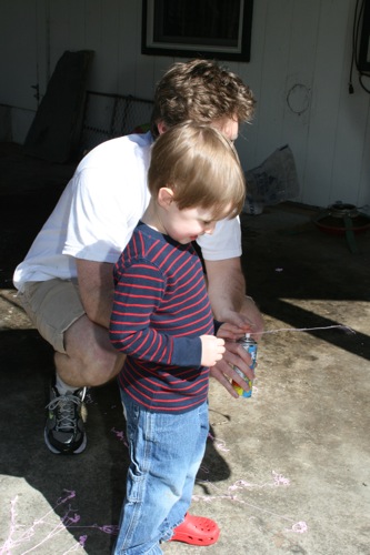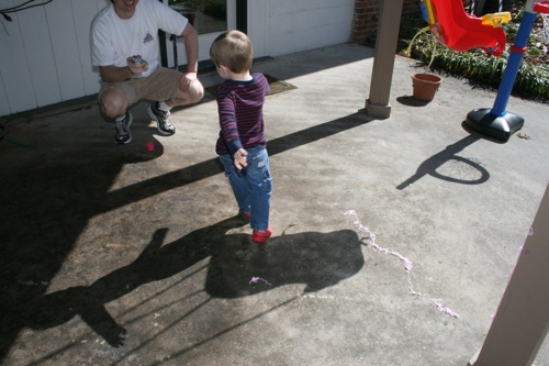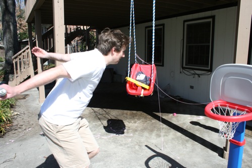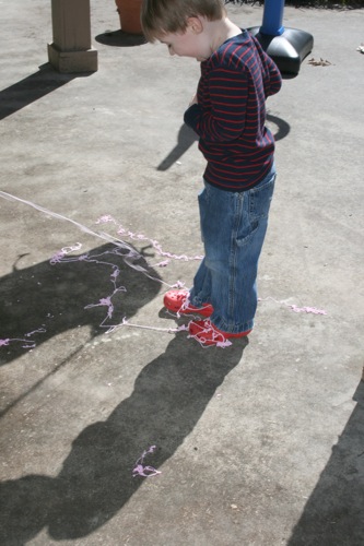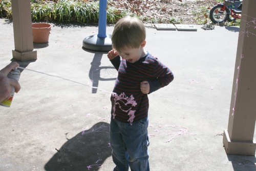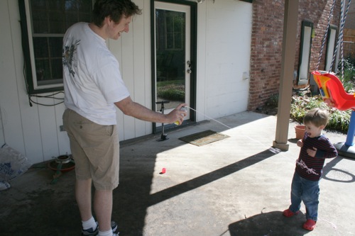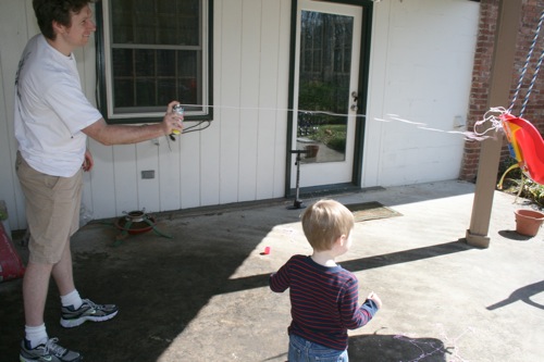 On Saturday Liam and Matt ventured across the street where our neighbor was having an “estate sale.”  I say “estate sale” instead of estate sale because the woman who lives there was under the mistaken assumption that an “estate sale” just means it’s held inside a house.  I think I’m going to stop calling our house The Ranch and start referring to it as The Estate.  Apparently it’s the thing to do these days.  Anyway, back to the point:  Liam and Matt went across the street to the yard sale that was taking place in our neighbor’s living room and the woman who was helping them gave Liam a can of silly string.  Liam and Matt broke it out on Sunday.  Here are some pictures of the big event.