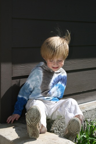 But as he picked up speed he temporarily lost his ability to hear which resulted in him not hearing me as I yelled at him to put his feet down to slow down or stop. He crashed at the bottom of the hill and it definitely shook him up. I convinced him to get back on and try again, this time making sure he heard me tell him to put his feet down. Here he is at the top of the hill for another go at it: