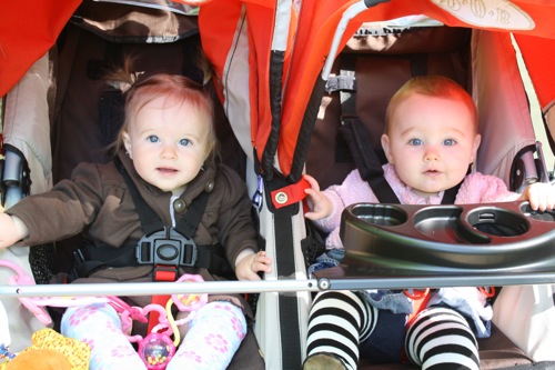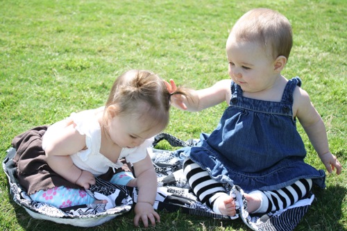 Gardens Through PJ’s Lens These are pictures that PJ caught yesterday: We’re getting closer to that mythical shot: They WERE all looking at PJ! Paige goes for pigtail, Sylvie goes for grass: No words necessary. Two cameras are always better than one!