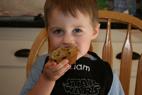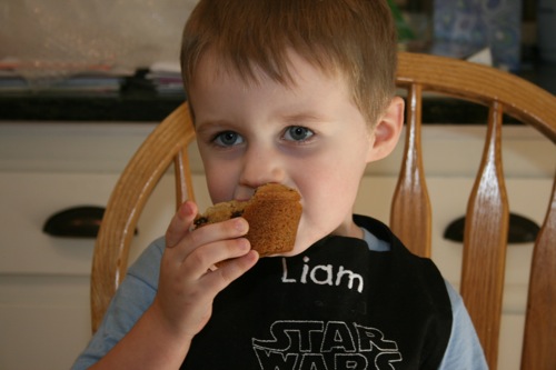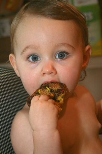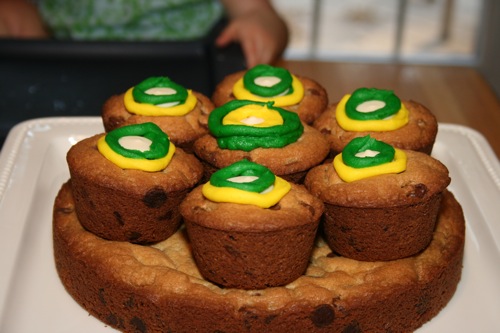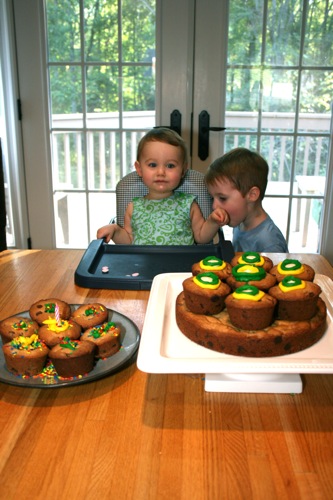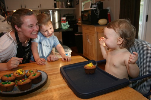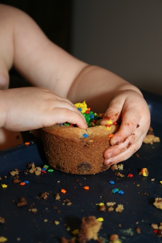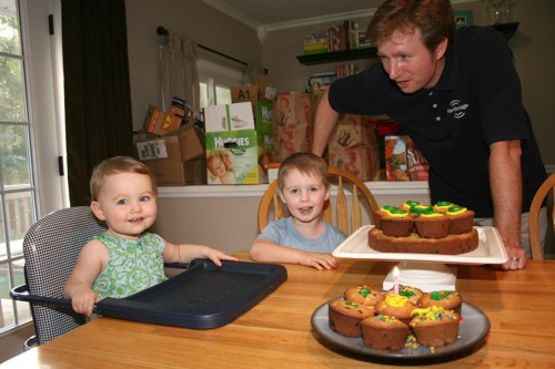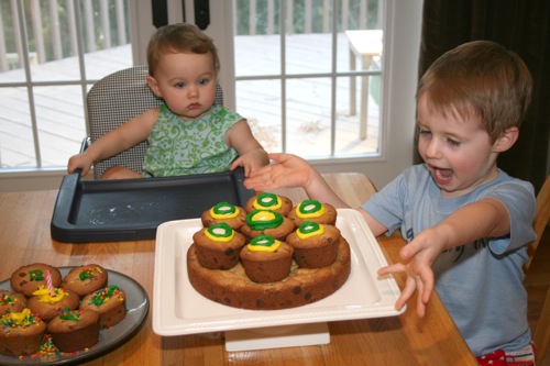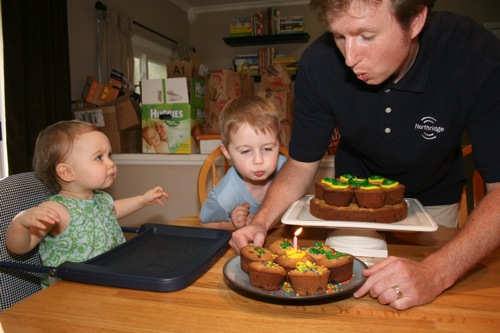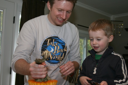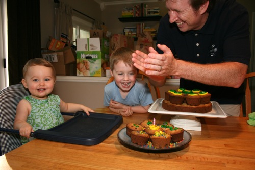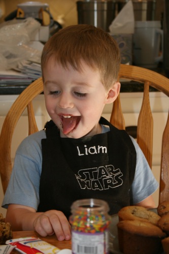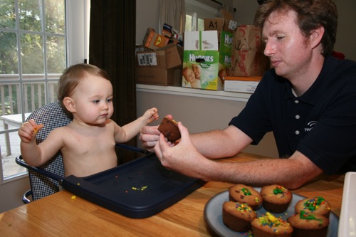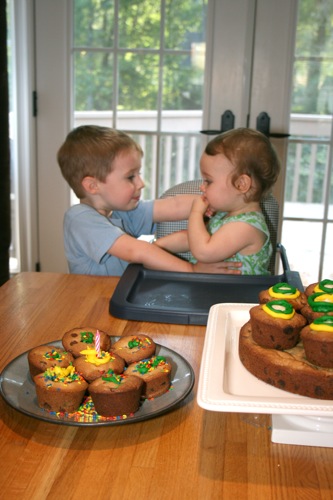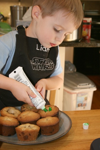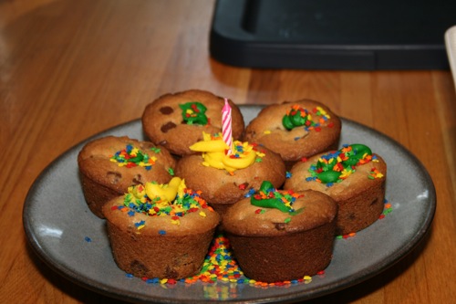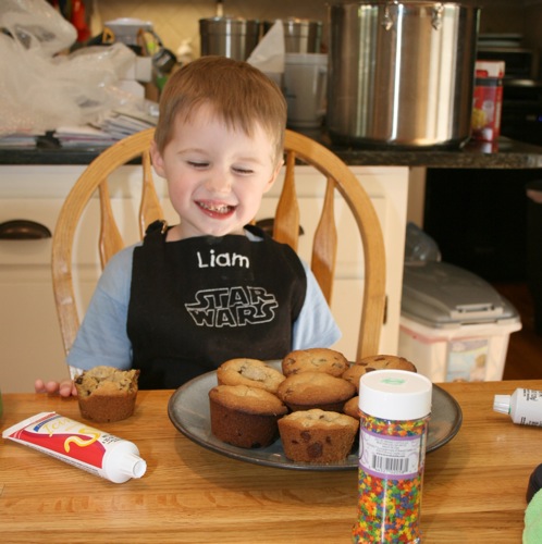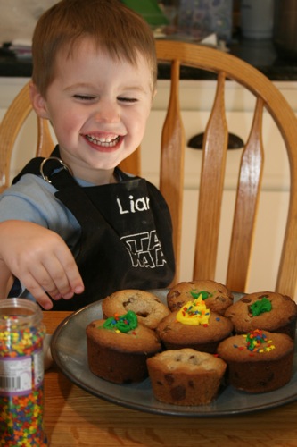 For Paige’s initial birthday celebration (on her birthday, as opposed to her bigger celebration which was 4 days later) Liam and I made chocolate chip cookie cupcakes. Â He helped measure, mix, stir and decorate.