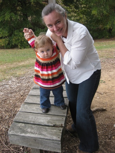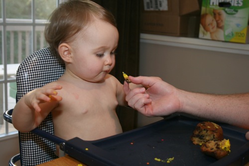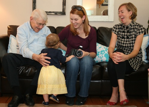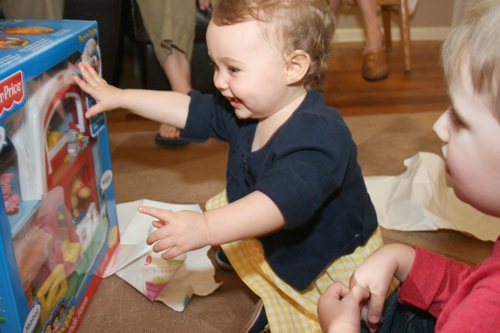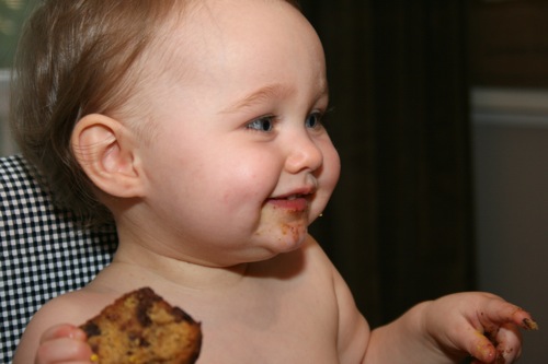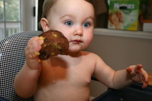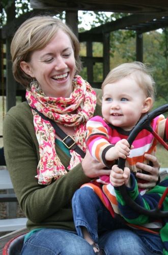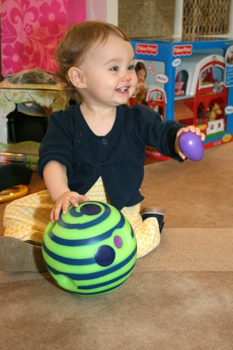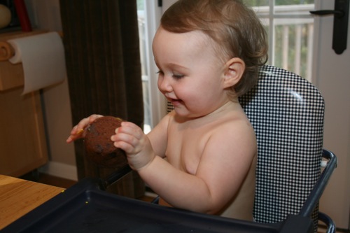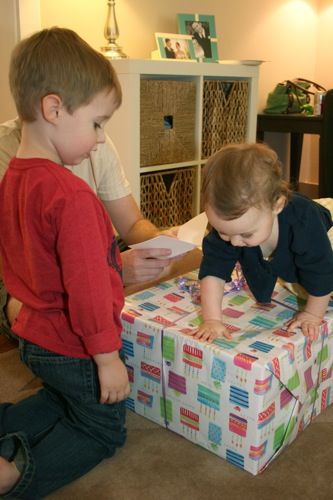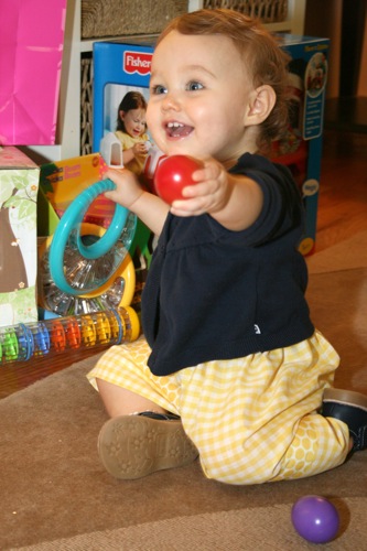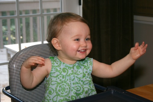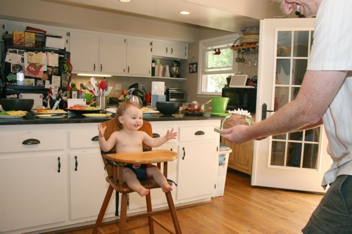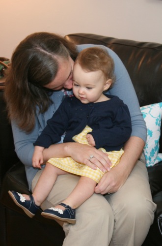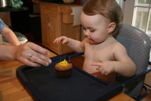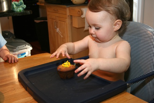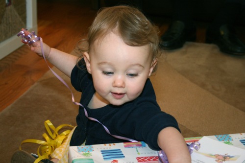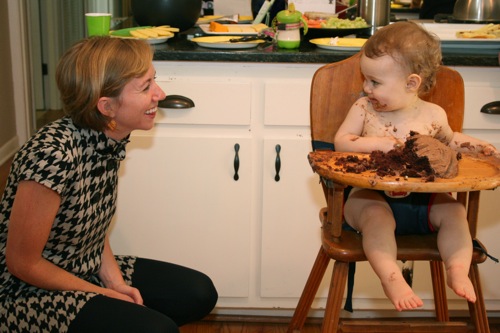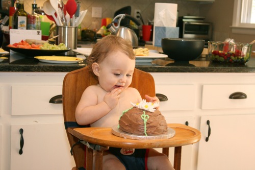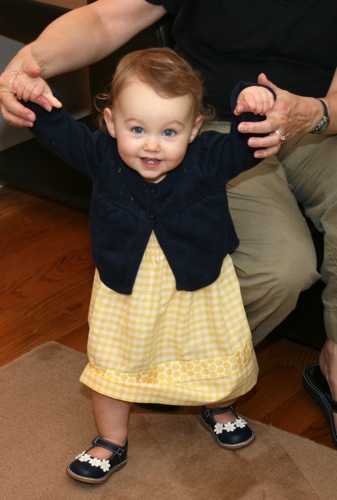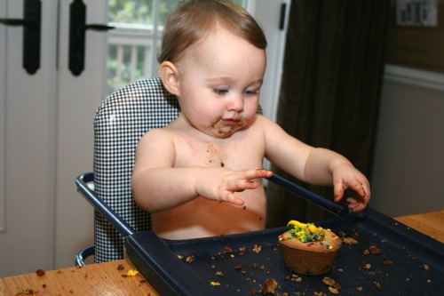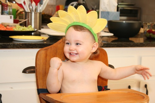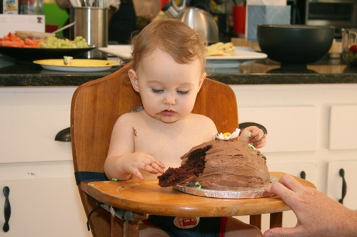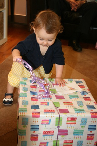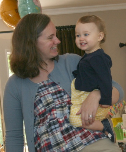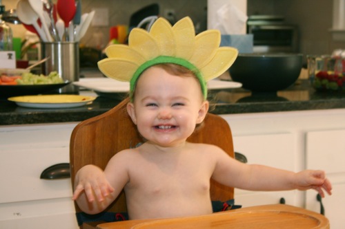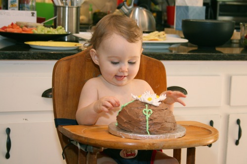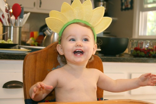 The birthday girl wakes up from her nap and gets into her party duds. Â [I was in the process of making her a daisy dress when I got sick so we improvised with this dress I’d already made. Â There was no diaper cover and I was bummed about not finishing the dress I’d planned (I did finish it eventually — another post for another day) but she was adorable, if I do say so myself.]