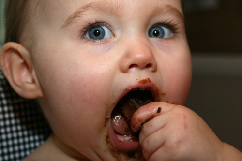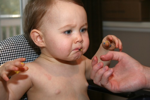 We let Paige play with a lollipop she found in the treat bag. Â Her very high interest level should have been a clue to me but I just thought she’d seen Liam eating one and was mimicking his behavior. Â As it turns out? Â She managed to chew through the wrapper and was helping herself. Â Oy.