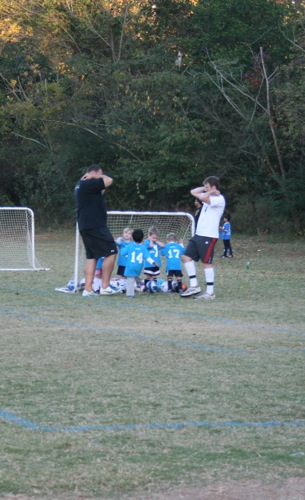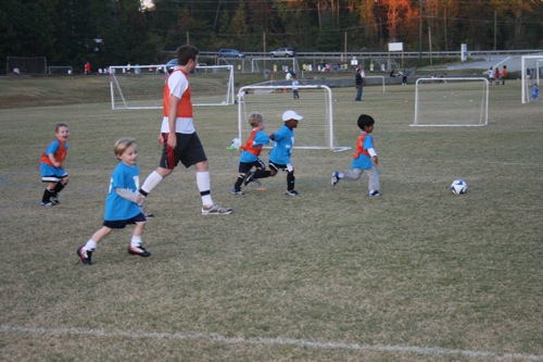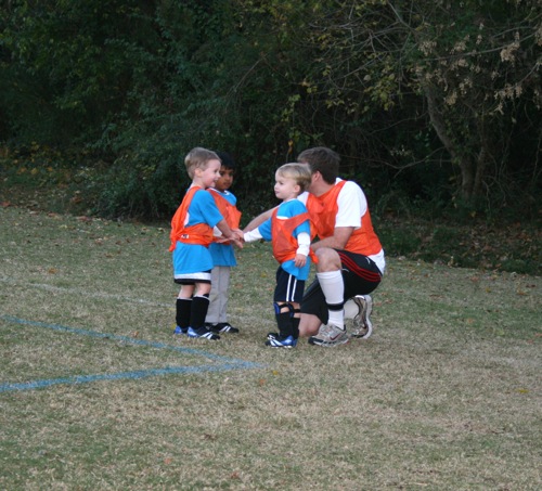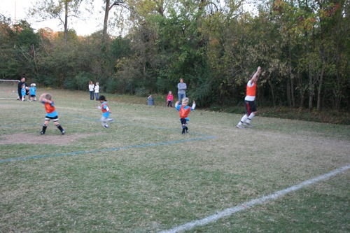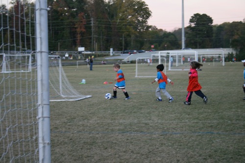 This is what a “scrimmage” of 3 year olds looks like (at least for the first 20 seconds or so until there is a total breakdown and people are running off the field or staring into space…):