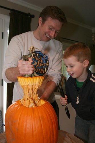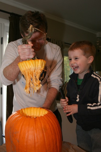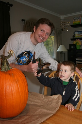 After last year’s “oops we’re too exhausted to live and it’s already Halloween and we completely forgot to carve our pumpkin…good thing Liam’s not old enough to notice and/or care” debacle we made sure to make time for pumpkin carving. Liam was *very* excited.