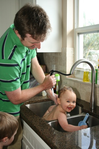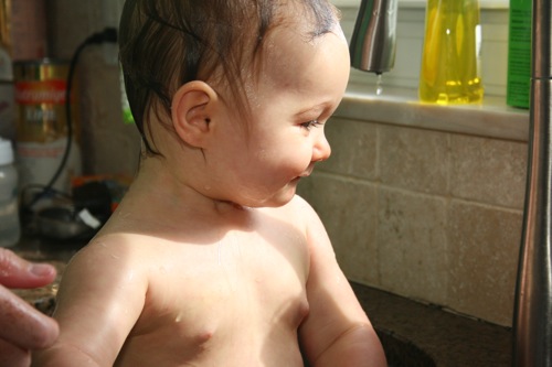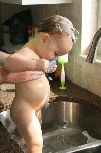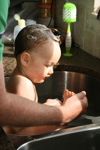 Paige is finally old enough to be bathed with Liam.  They both have a ball when we have the time to do it this way (as opposed to me bathing Paige in the morning while Liam is in school and Liam taking super-fast showers with Matt because we ran out of time…again).  Here are some pictures from a few weeks ago of just such an occasion.