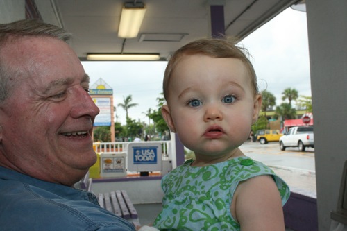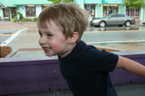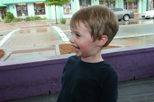 Every year as a child I was allowed to pick one goody from the Beach Bazaar.  We’ve continued the tradition with our own kids.  The whole place is full to the brim with ticky-tacky crap: fake roaches, highly inappropriate mugs, seashell necklaces, etc.  My kid?  He finds the only train in the place and decides he MUST take it home.  Here he is showing it off after we got back to the condo: