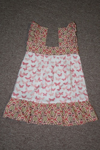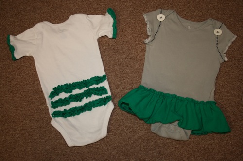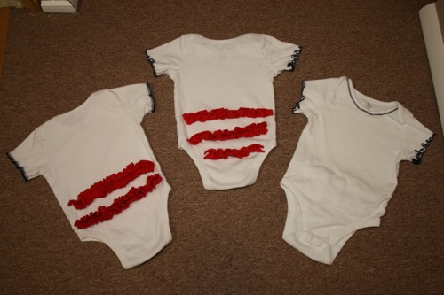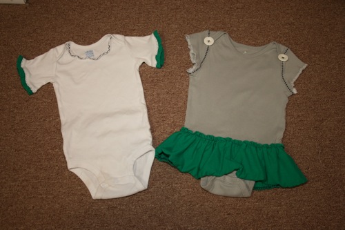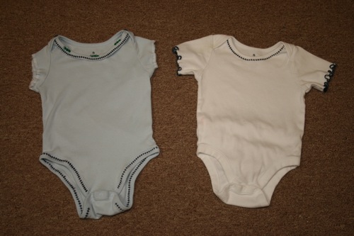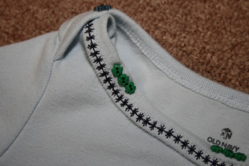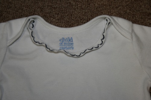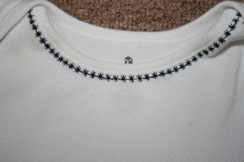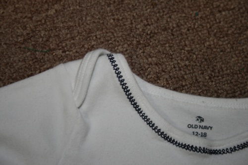 Because the original shirt had been well loved for 10 years I had to do some tricky cutting to make the front and back straight.  I lost a bit of the wording at the top, but considering that it originally covered my entire shoulders and was downsized into an infant romper I was pretty pleased with the result.